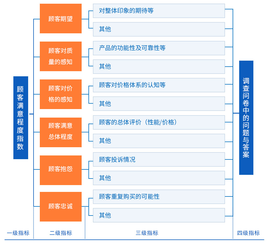 滿意度研究指標(biāo)的四個層次如下圖表示。