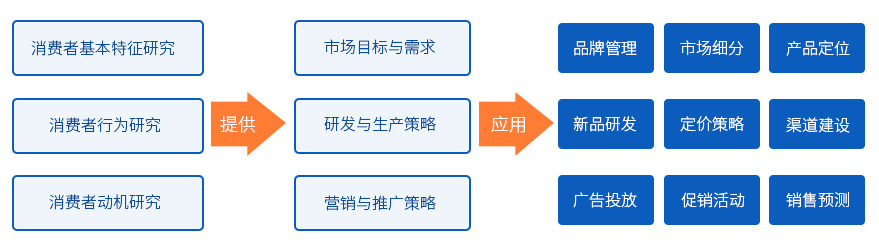 消費(fèi)者研究是市場調(diào)研領(lǐng)域應(yīng)用最多的消費(fèi)品市場研究的一個(gè)最基礎(chǔ)、主要的組成部分,包括消費(fèi)者基本特征研究、消費(fèi)者行為研究、消費(fèi)者動(dòng)機(jī)研究三大部分。通過這三個(gè)層面的研究,為相關(guān)行業(yè)和企業(yè)提供:市場細(xì)分、產(chǎn)品定位、品牌管理、定價(jià)策略、新品開發(fā)、渠道建設(shè)、廣告投放、促銷活動(dòng)、銷售預(yù)測等行為的理論、數(shù)據(jù)基礎(chǔ)。