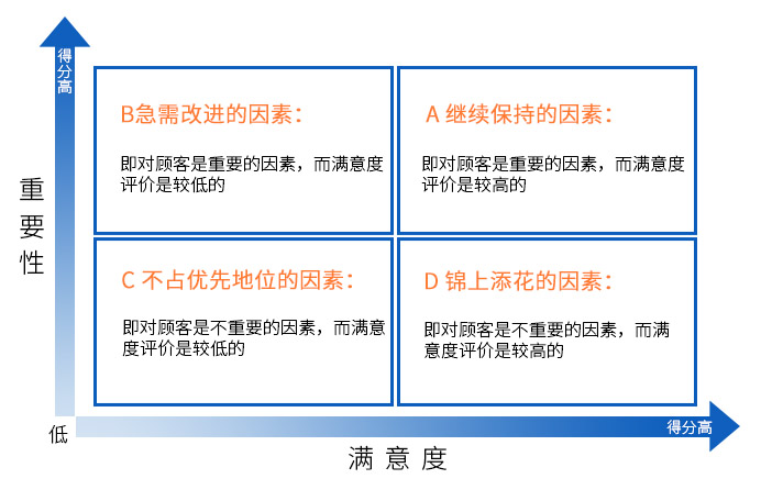 通過顧客對(duì)因素重要性的評(píng)價(jià)和滿意度評(píng)價(jià),能夠區(qū)分出四種類型的因素,同時(shí)對(duì)企業(yè)或服務(wù)進(jìn)行分析得出:
